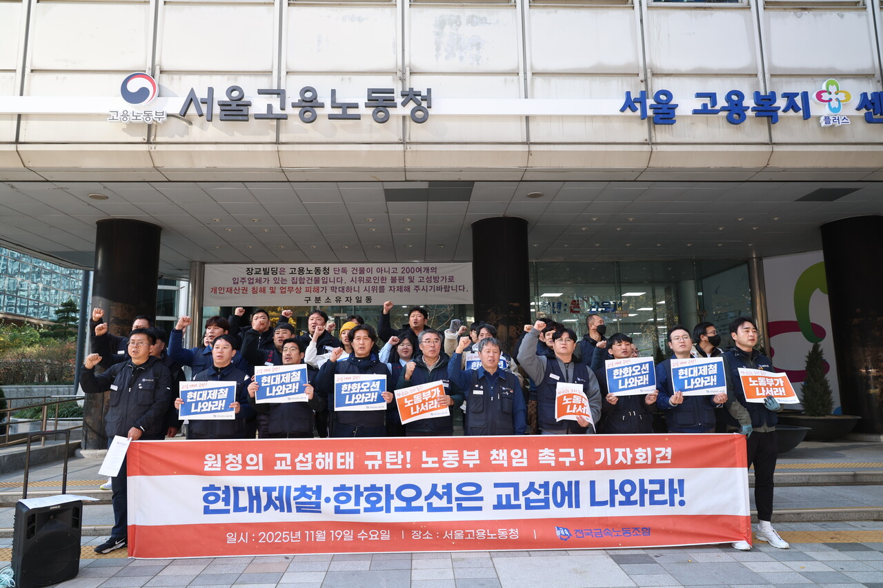 금속노조는 "법원에서 이미 현대제철·한화오션이 하청 노동자와의 교섭을 거부하는 것은 부당노동행위라는 판단이 나온 지 4개월이 지났지만, 두 회사 모두 여전히 교섭을 회피하고 있다"고 밝혔다.