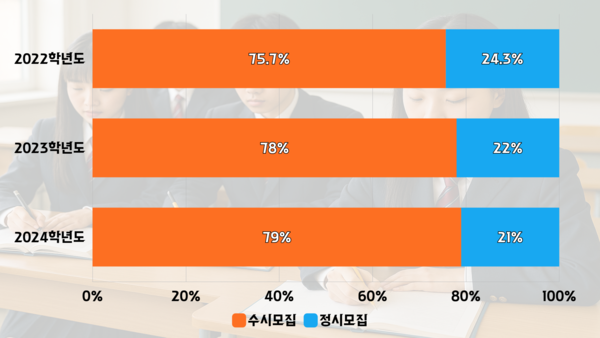 한국대학교육협의회에 따르면 2024학년도 4년제 대학 전체 모집 인원의 79.0%가 수시였고 정시는 21.0% 수준이었다. 오는 2027학년도에는 수시 비율이 80.3%까지 오를 전망이다.