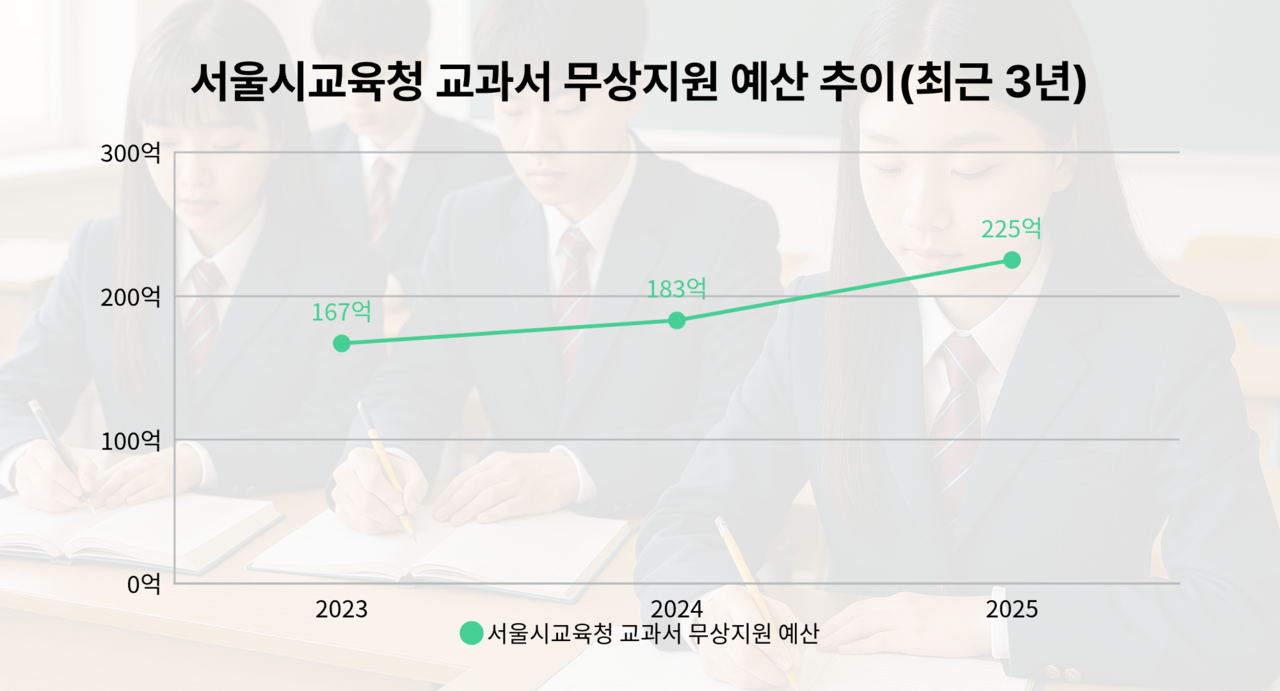 실제로 서울시교육청은 교과서 무상지원을 위해 최근 3년간 대규모 예산을 투입해왔다. 편성 내역을 보면 ▲2023년 167억 원 ▲2024년 183억 원 ▲2025년 225억 원으로 매년 지원 규모가 확대되고 있다.