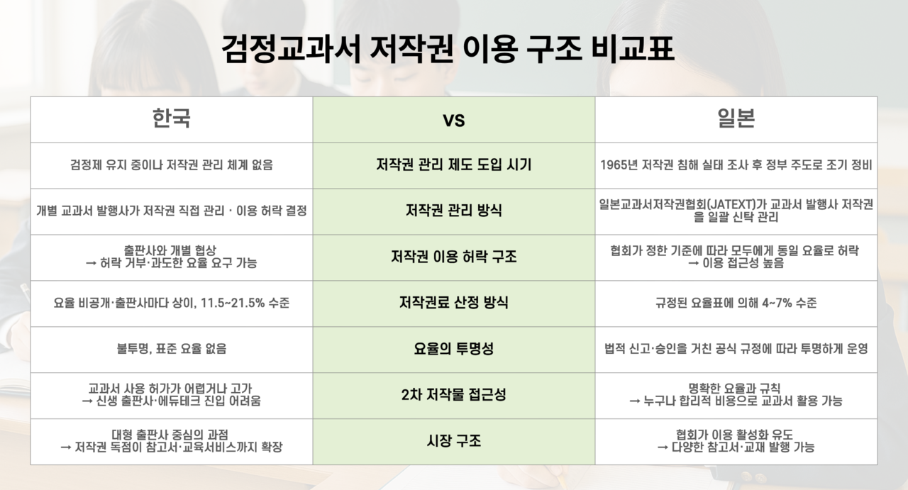 국내 교과서 발행사가 요구하는 저작권 이용료는 11.5~21.5% 수준으로 추정되는 반면, 일본은 4~7% 수준에 불과하다.