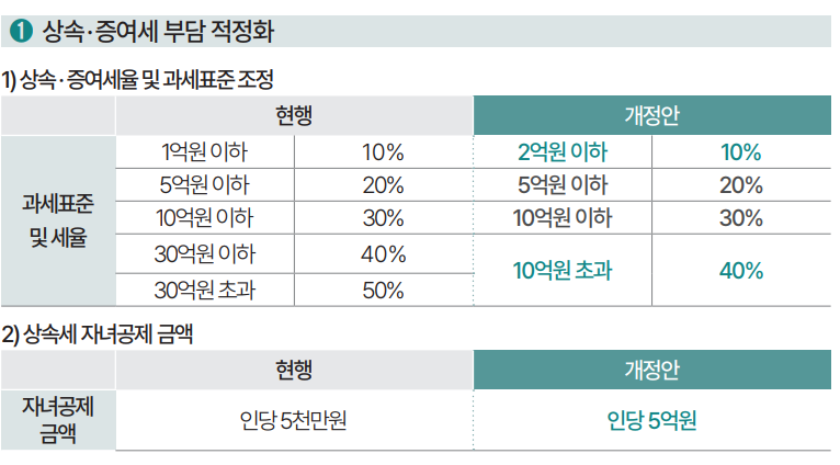 해당 개정안에 따르면 상속세 최고세율이 50%에서 40%로 내려간다. 현행 과표 30억원 초과분에 최고세율 50%가 적용되는 구간은 사라진다.