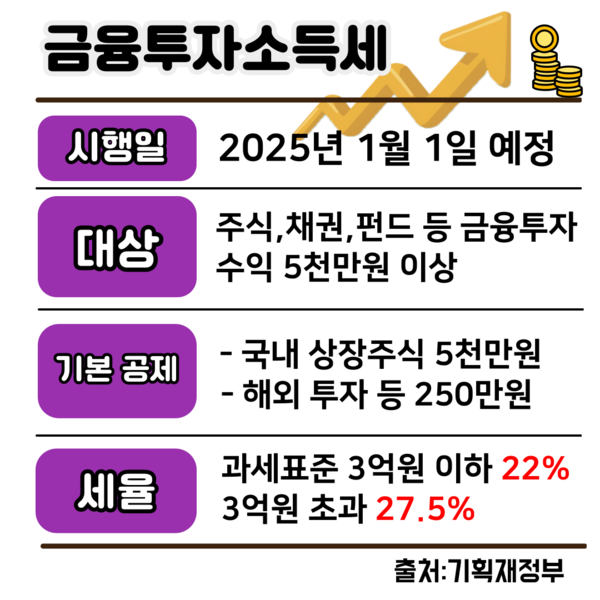 금투세는 소득세의 일종으로 주식·채권·펀드 등 금융투자 수익이 5천만원 초과 시 세금을 부과한다.